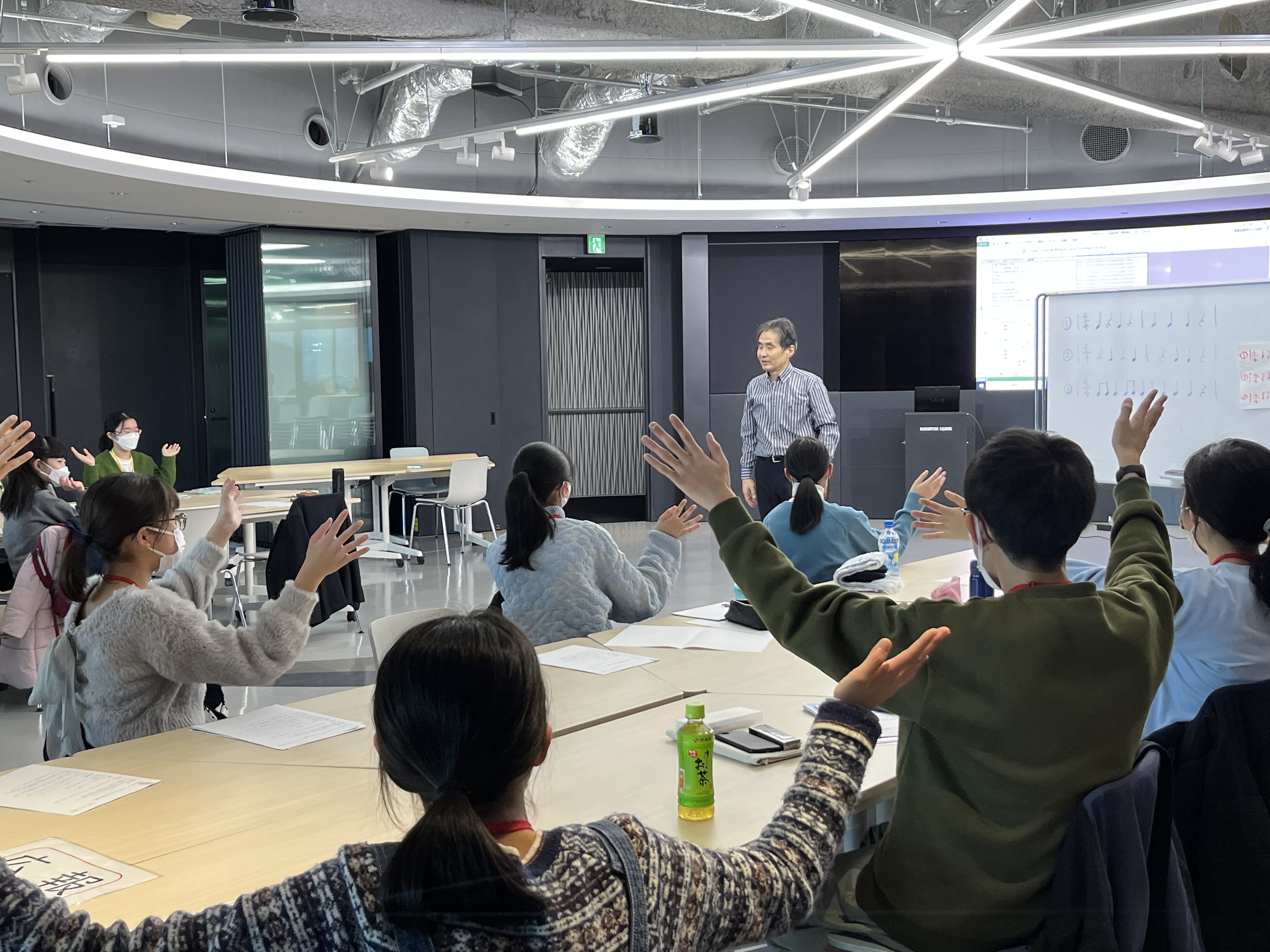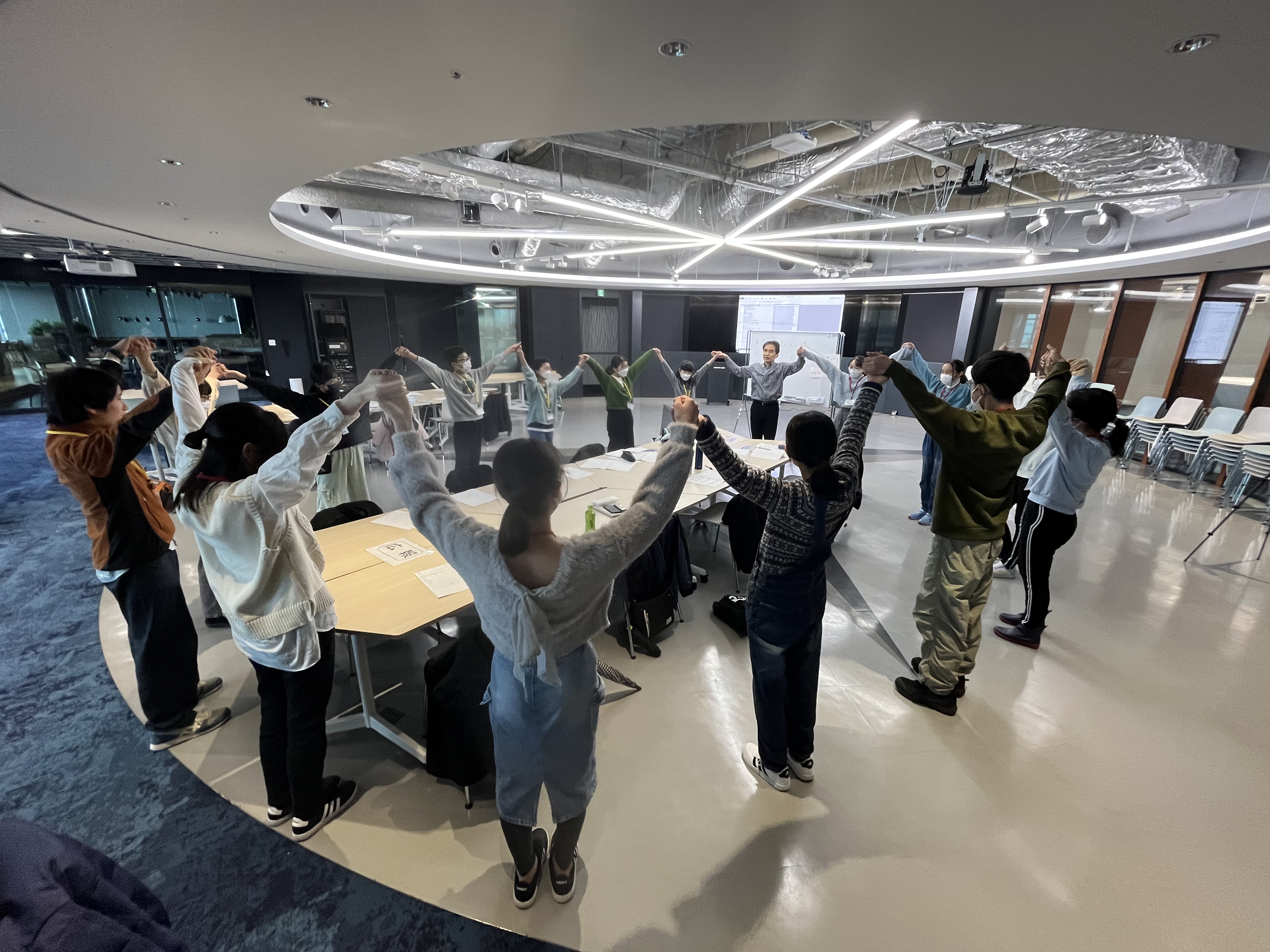 講座では、思っていたよりも体をたくさん動かしたり、前に出て踊ったりする機会が多く、始めは皆緊張して、消極的になっていたのですが、先生の優しく分かりやすいご指導のおかげで、この講座が終わる頃には、皆すっかり緊張も解け、思いっきり体を動かして、中には暑い!と手で顔を扇ぐ子もいたほどでした。